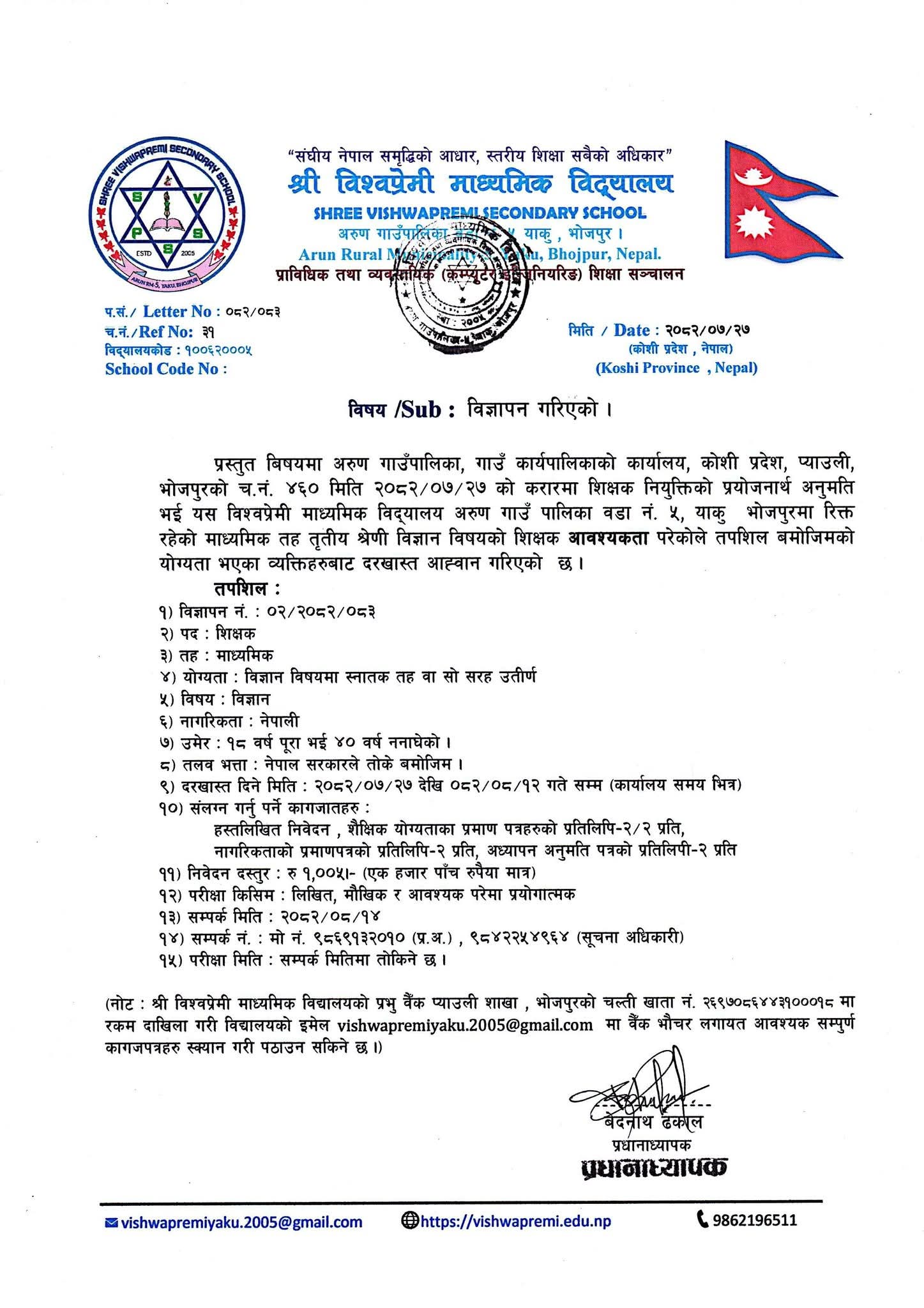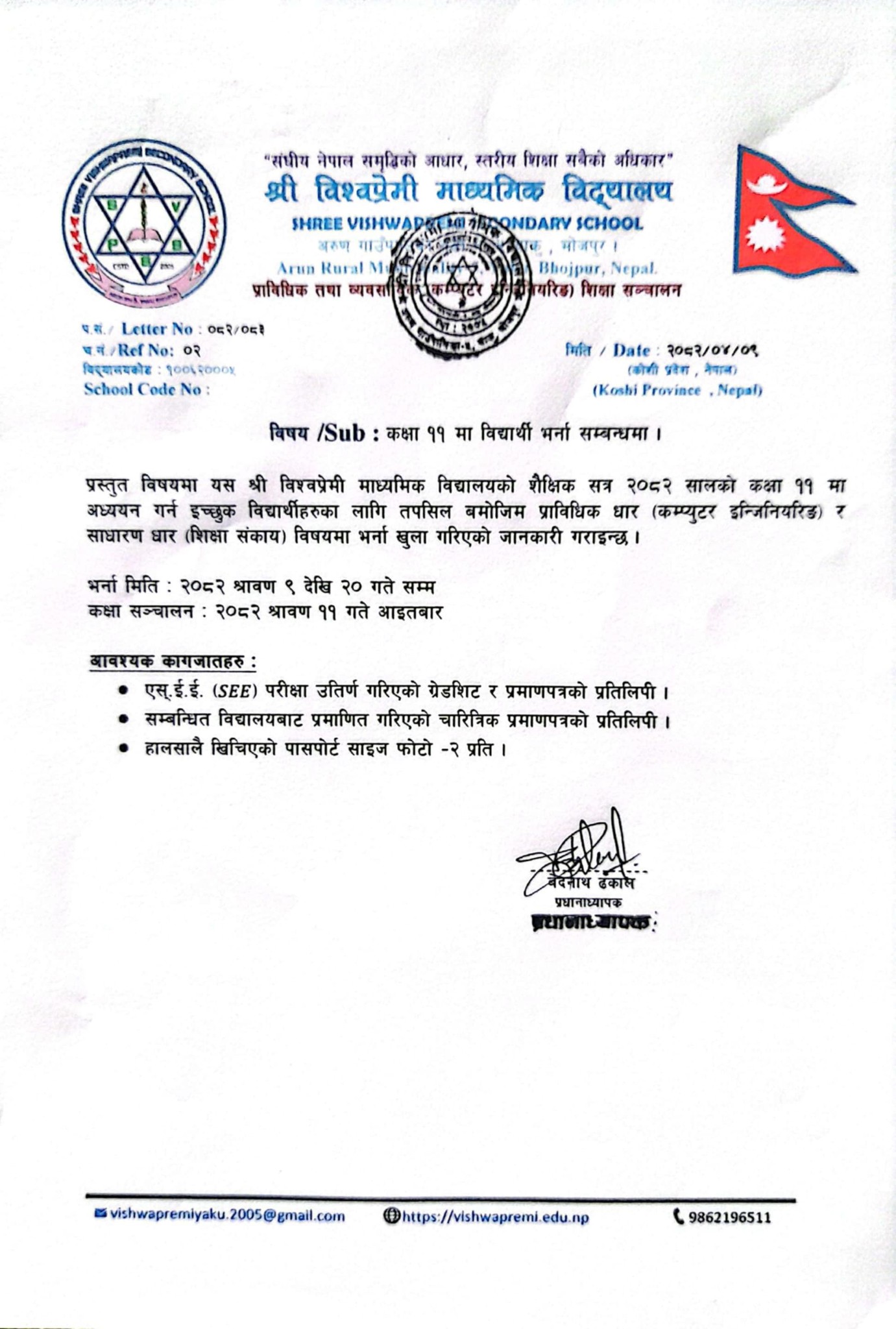 भोजपुर जिल्ला सदरमुकामबाट पूर्व दिशामा ११ कोस (५२ किमीको सडक दुरी) दुरीमा अवस्थित ऐतिहासिक एवम शैक्षिक पृष्ठभूमि बोकेको अरुण गाउँपालिका वडा नं. ५ मा अवस्थित यस श्री विश्वप्रेमी माध्यमिक विद्यालयले आफ्नो स्थापना कालदेखि विभिन्न आरोह अवरोह पार गर्दै समयको माग बमोजिमका विभिन्न कार्यक्रमहरुका साथ भोजपुर जिल्लाको शैक्षिक जगतमा आफ्नो छुट्टै पहिचान कायम गर्न सफल भएको छ । ।