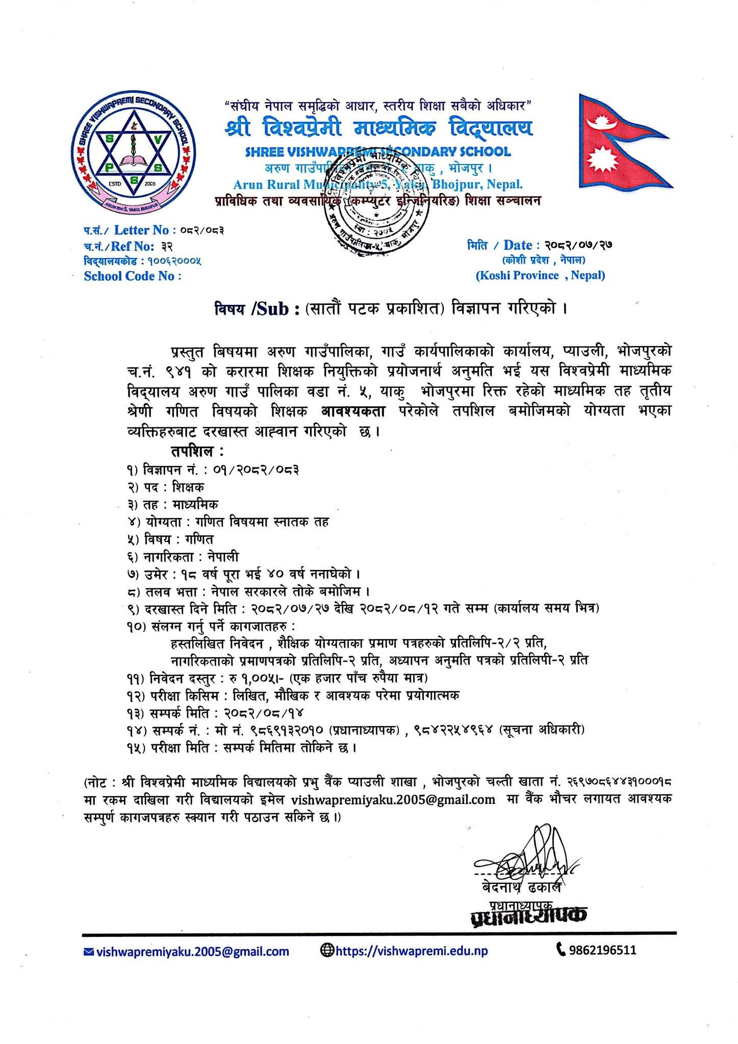 भोजपुर जिल्ला सदरमुकामबाट पूर्व दिशामा ११ कोस (५२ किमीको सडक दुरी) दुरीमा अवस्थित ऐतिहासिक एवम शैक्षिक पृष्ठभूमि बोकेको अरुण गाउँपालिका वडा नं. ५ मा अवस्थित यस श्री विश्वप्रेमी माध्यमिक विद्यालयले आफ्नो स्थापना कालदेखि विभिन्न आरोह अवरोह पार गर्दै समयको माग बमोजिमका विभिन्न कार्यक्रमहरुका साथ भोजपुर जिल्लाको शैक्षिक जगतमा आफ्नो छुट्टै पहिचान कायम गर्न सफल भएको छ । ।
